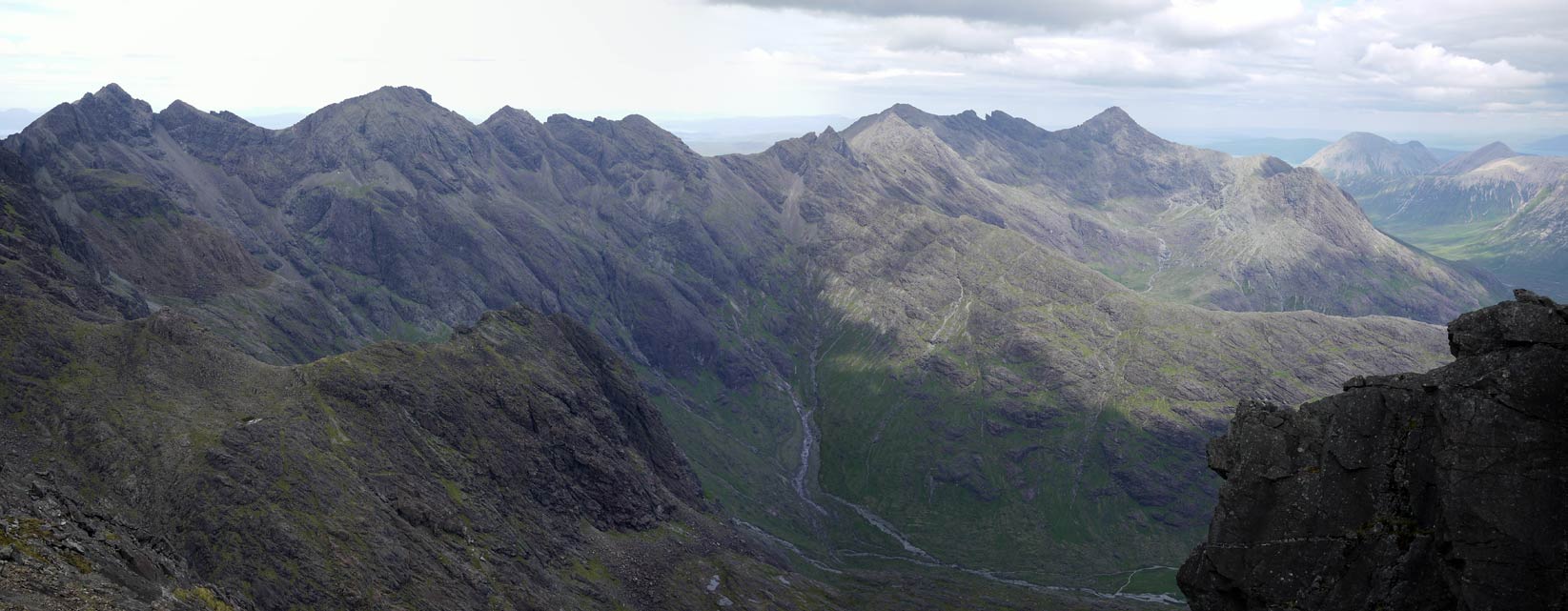 The wall in the foreground is the east face of Caisteal à Garbh-choire, with Sgùrr Dubh an Da Bheinn behind and Sgùrr Dubh Mòr to the right