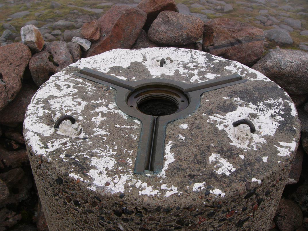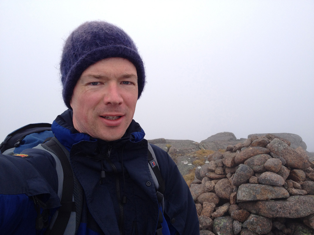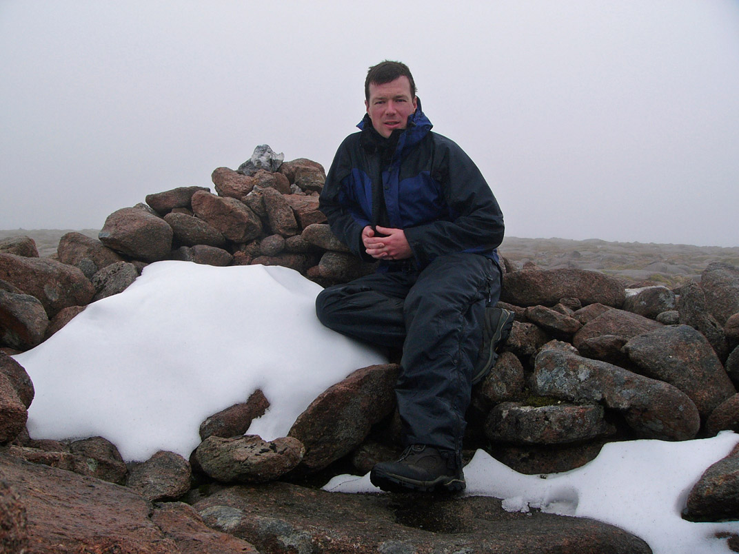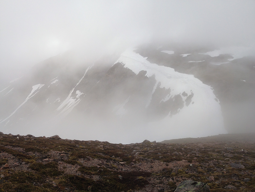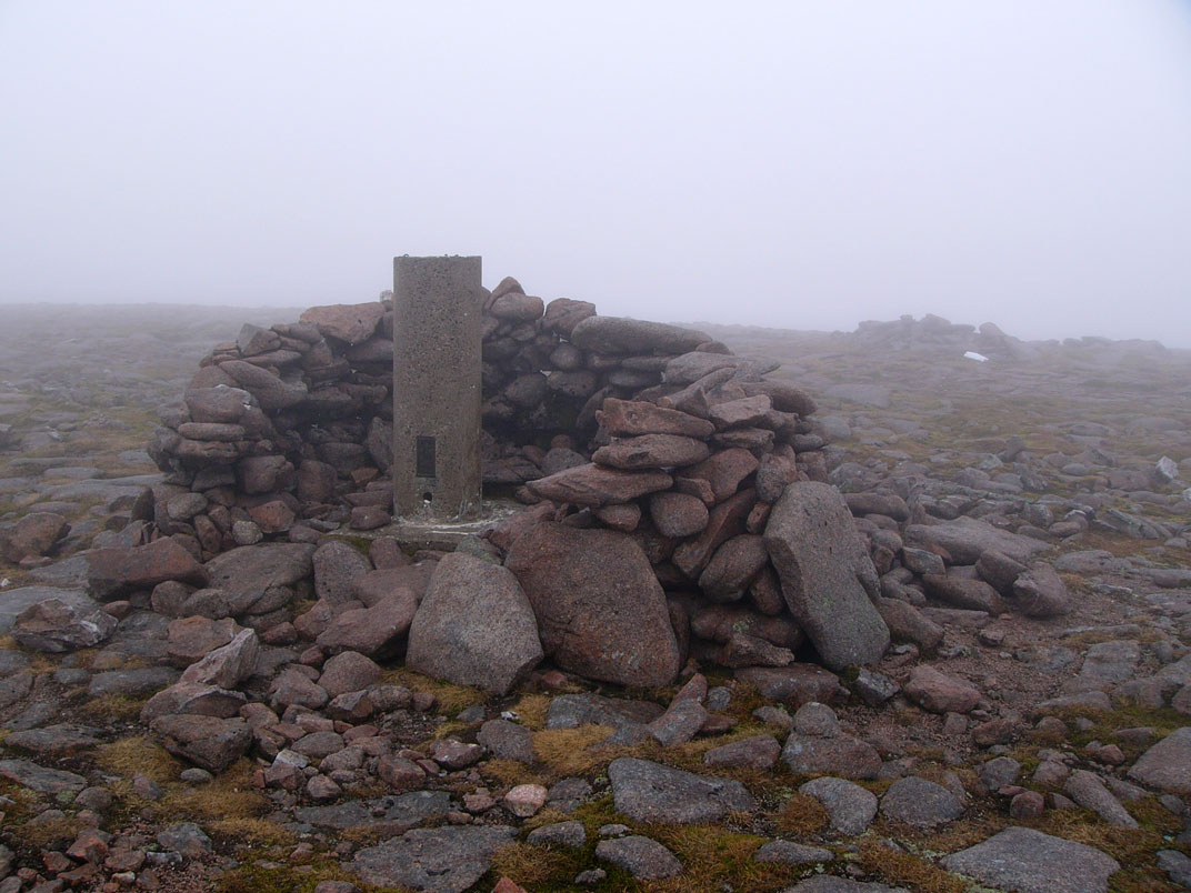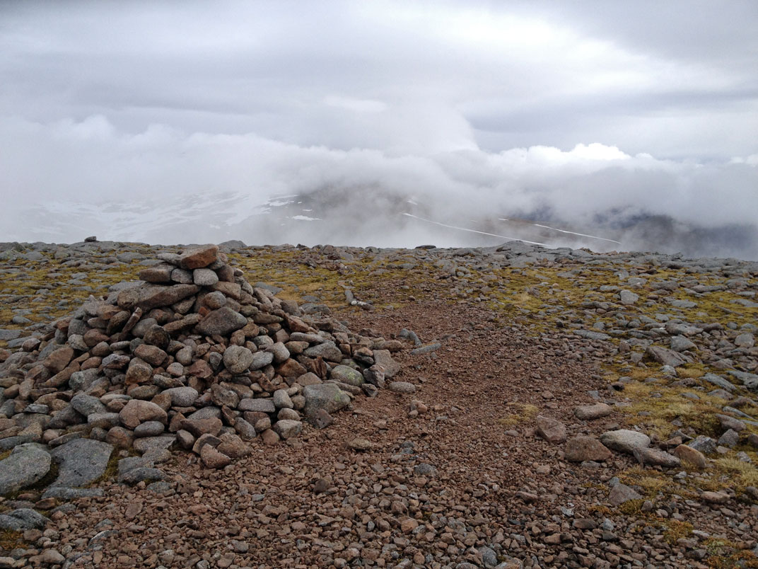 Monadh Mòr summit with Cairn Toul behind (in cloud) and the Devil’s Penis low to the right (also in cloud)