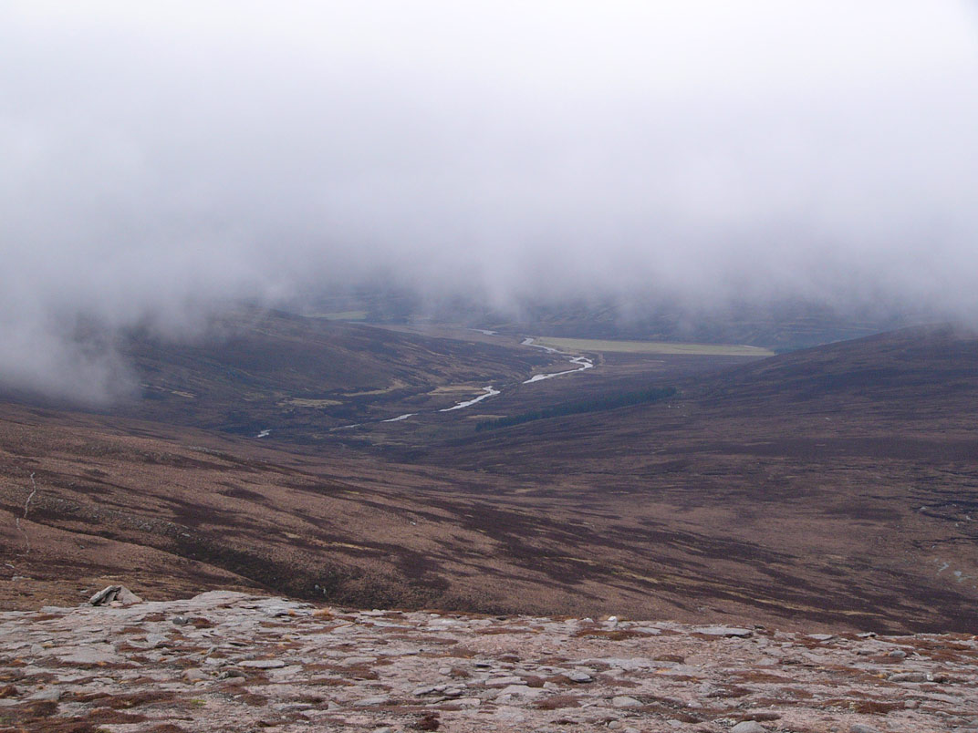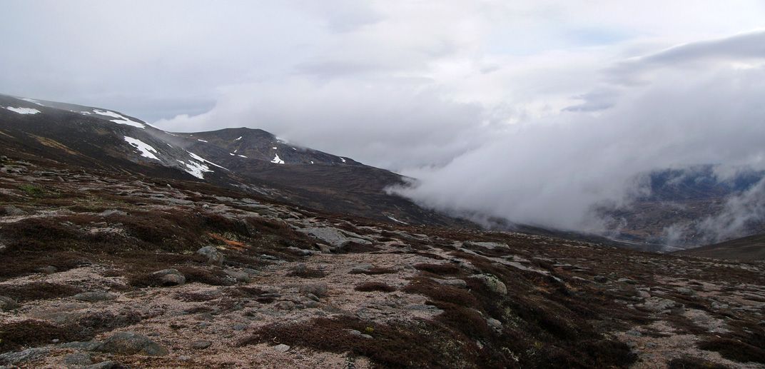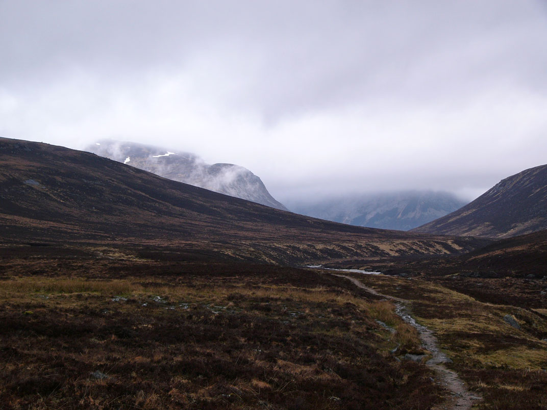 View back up Glen Dee to Ben Macdui (in cloud) and Carn a’ Mhaim