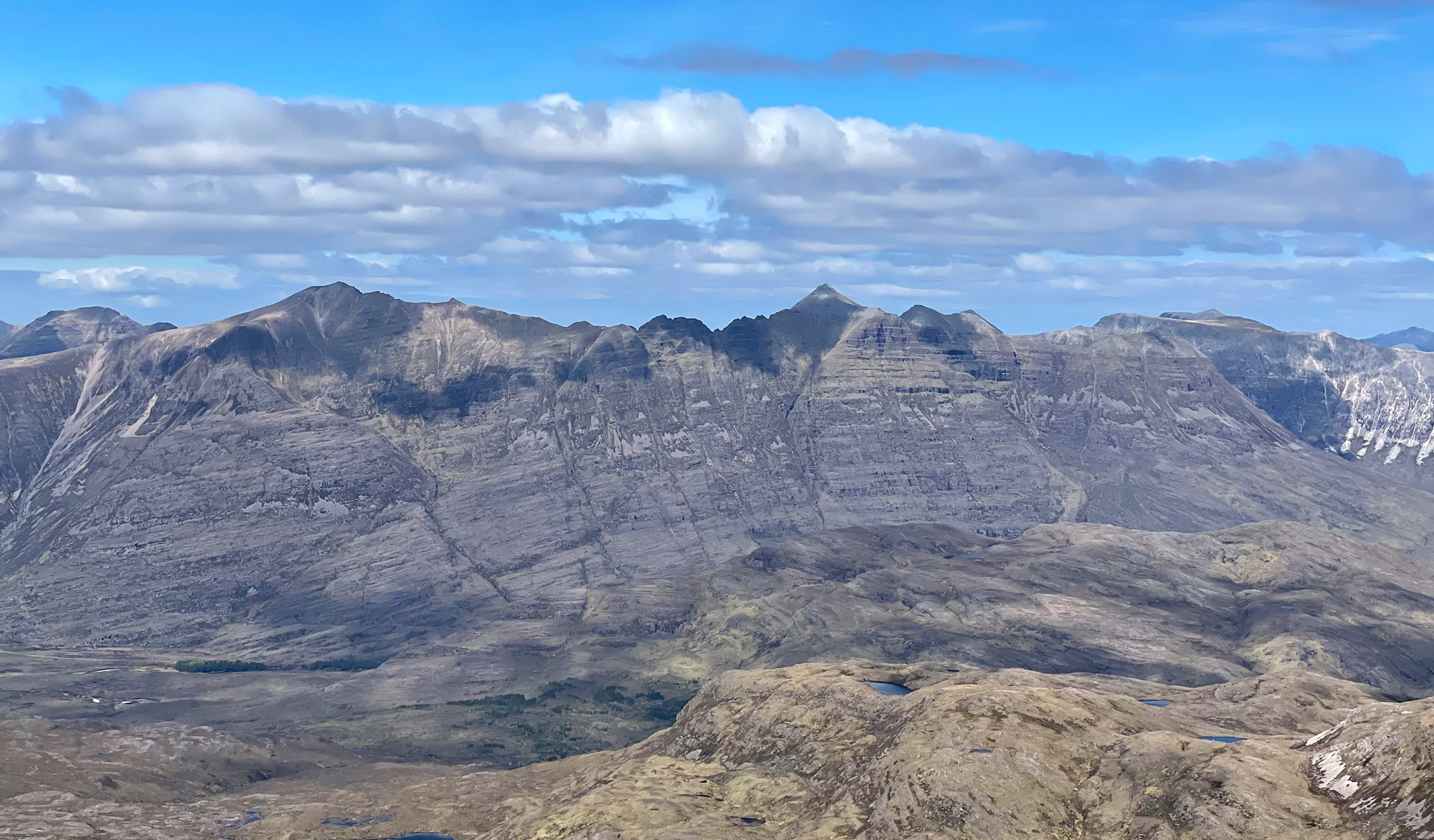 View north to a panorama of Beinn Alligin, Liathach and Beinn Eighe
