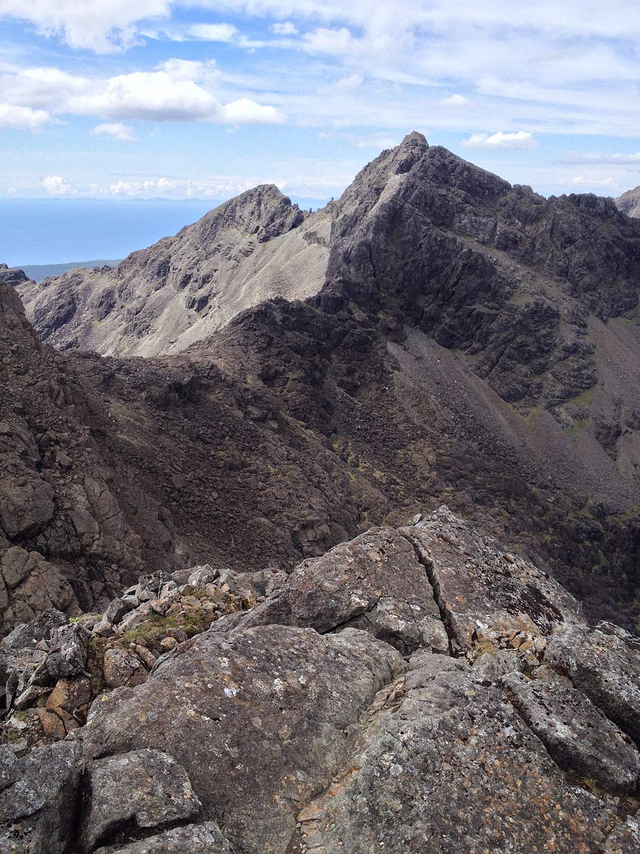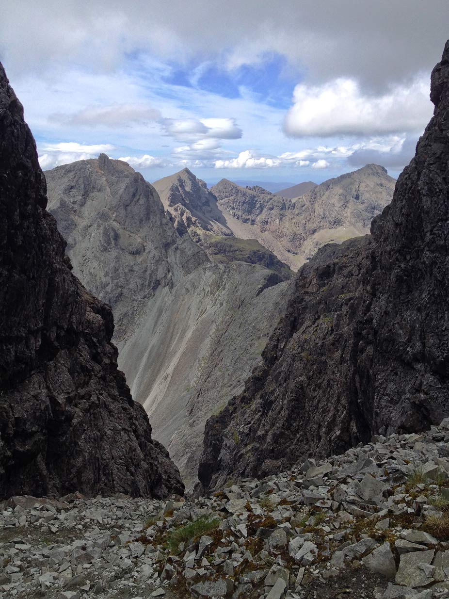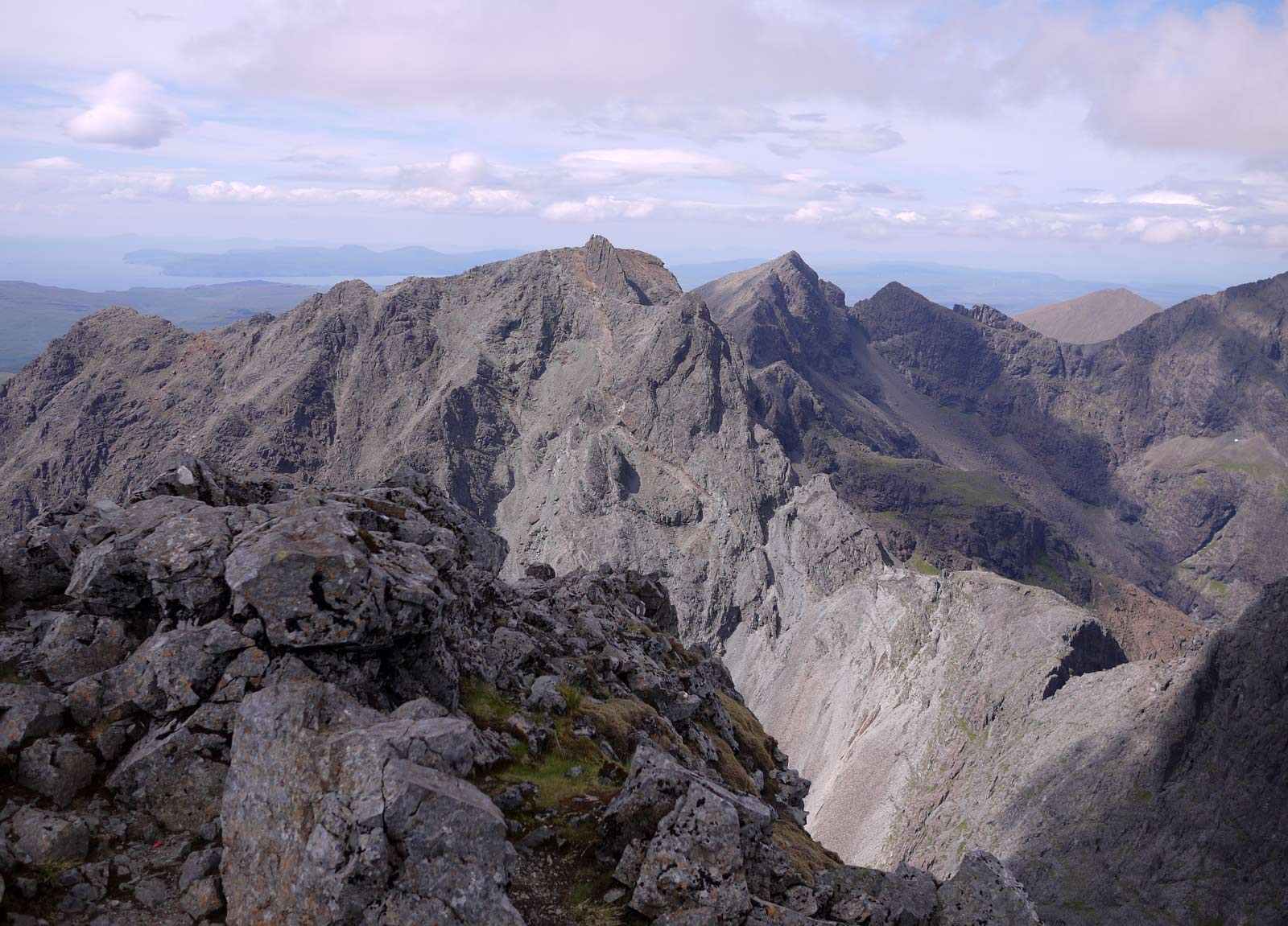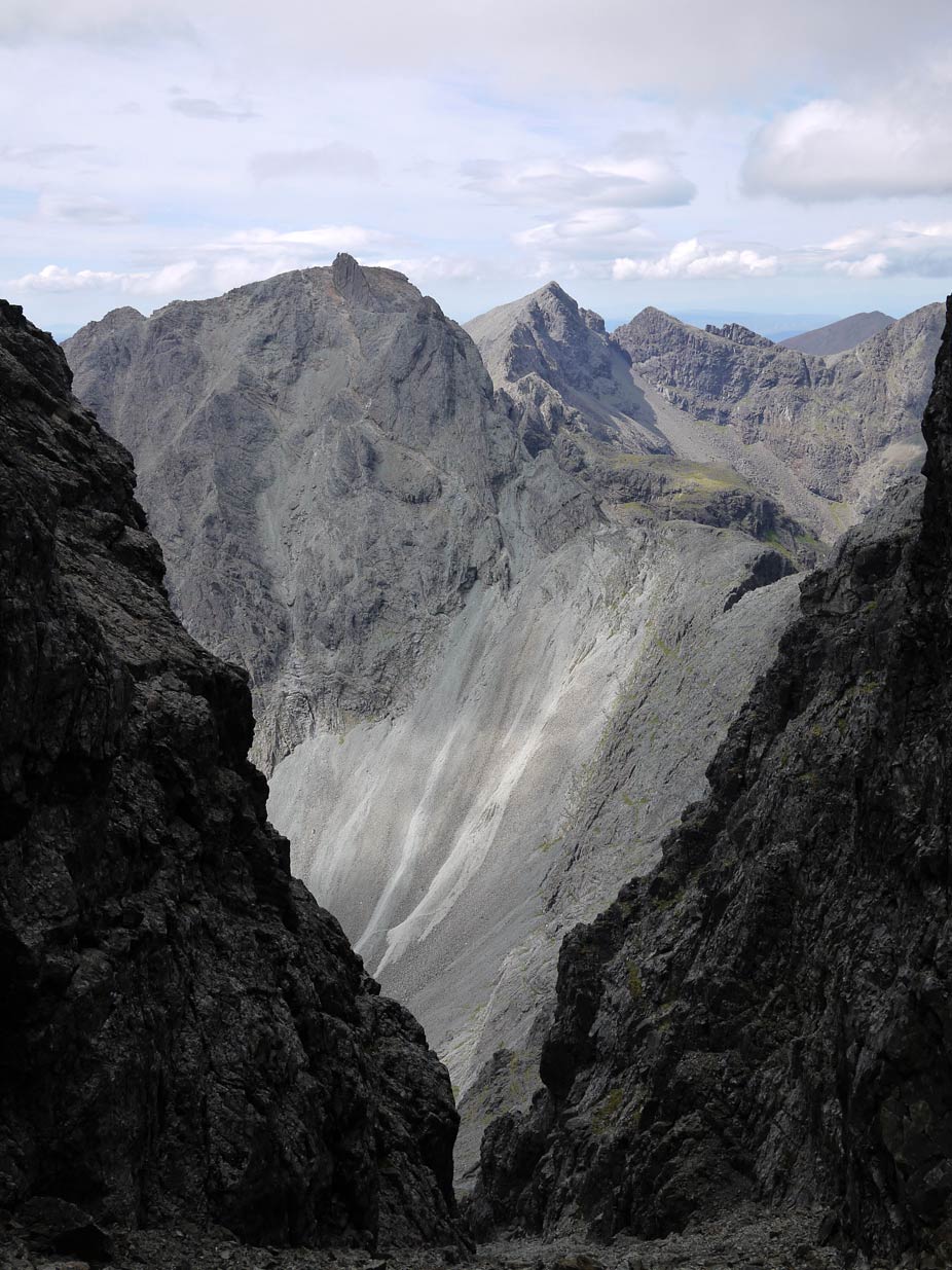 The wall in the foreground is the east face of Caisteal à Garbh-choire, with Sgùrr Dubh an Da Bheinn behind and Sgùrr Dubh Mòr to the right