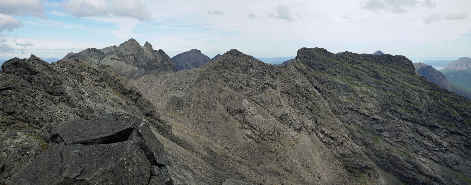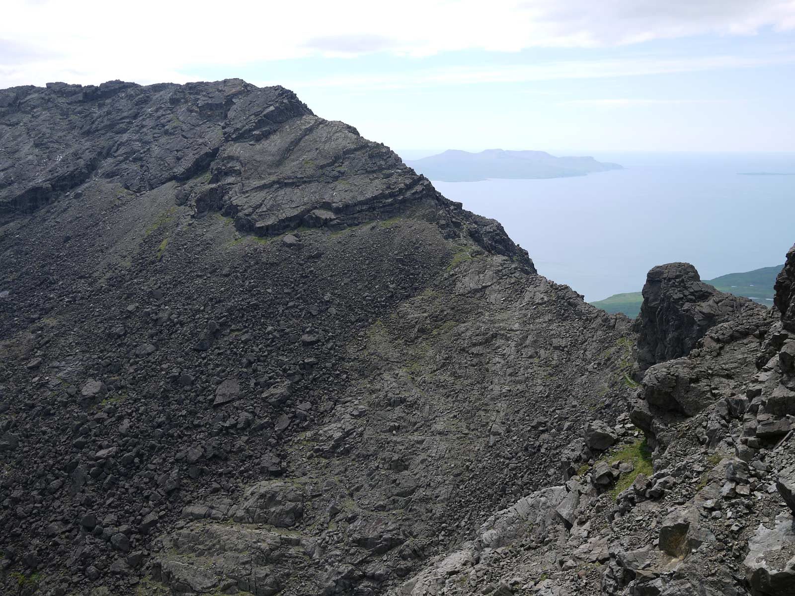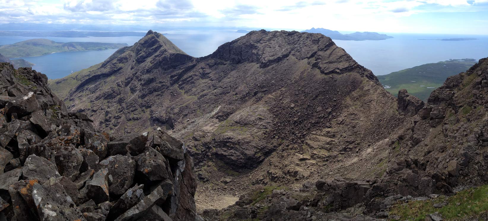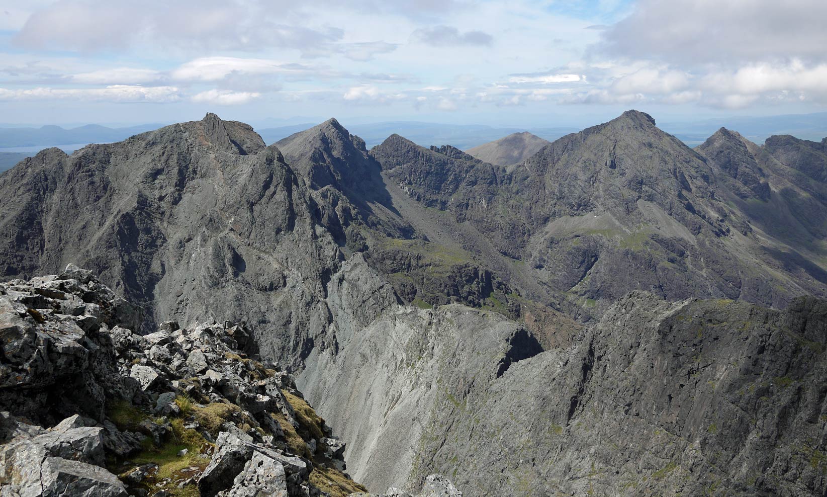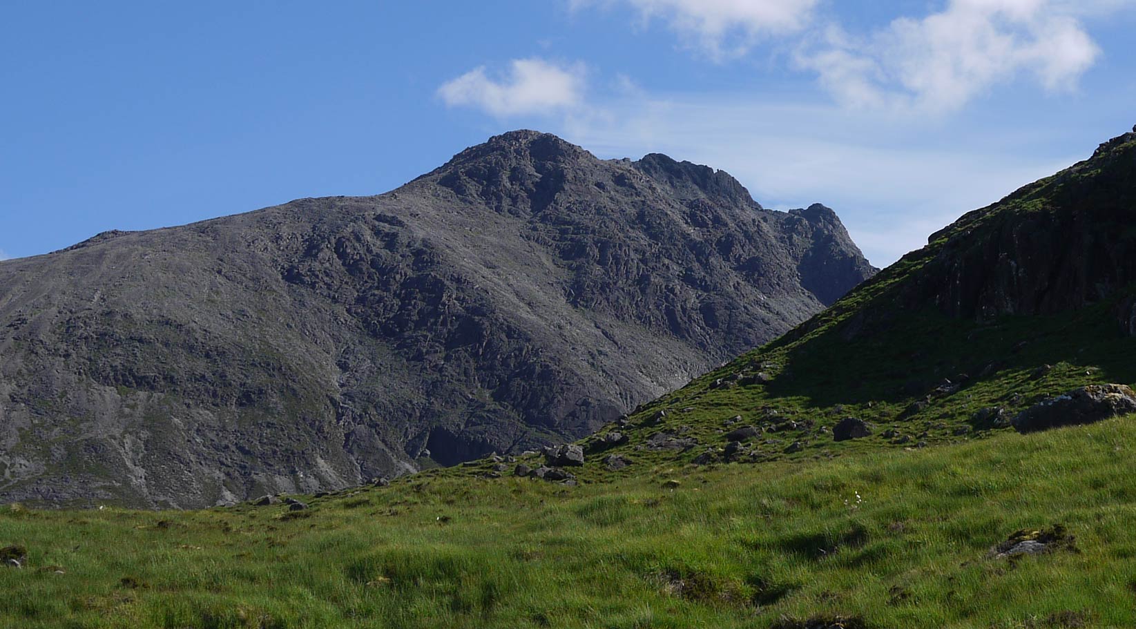 The wall in the foreground is the east face of Caisteal à Garbh-choire, with Sgùrr Dubh an Da Bheinn behind and Sgùrr Dubh Mòr to the right