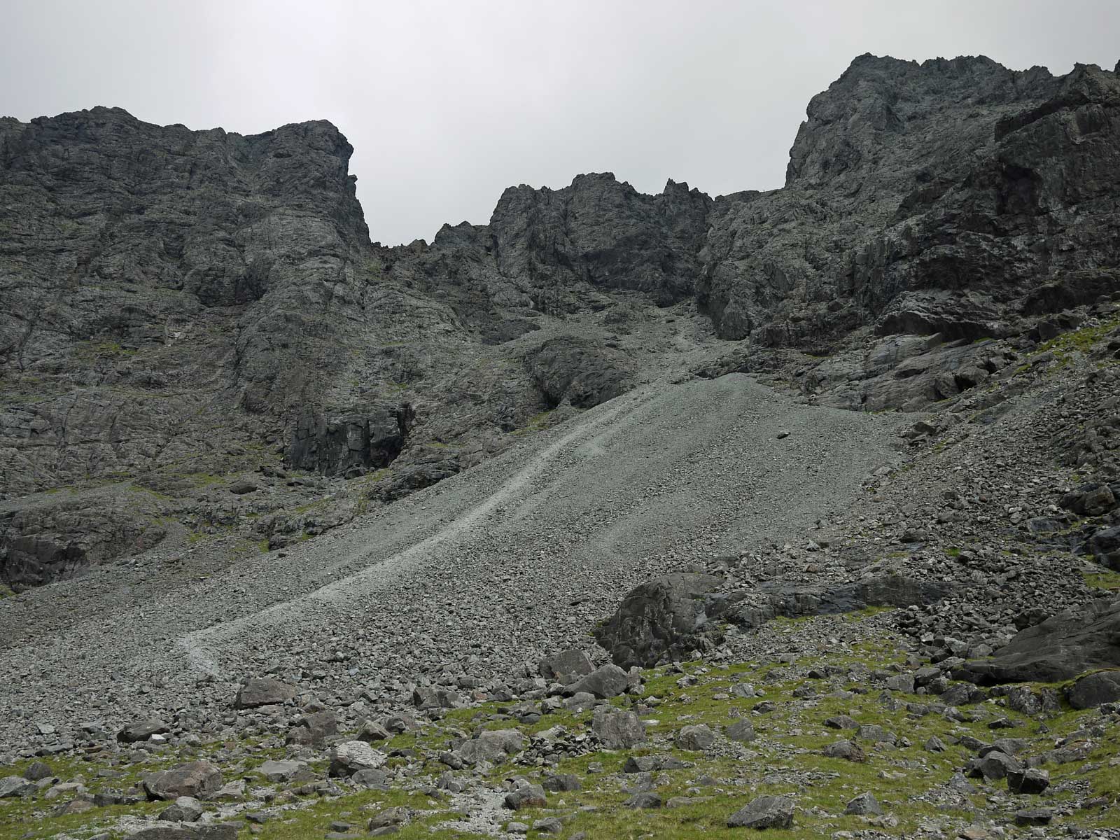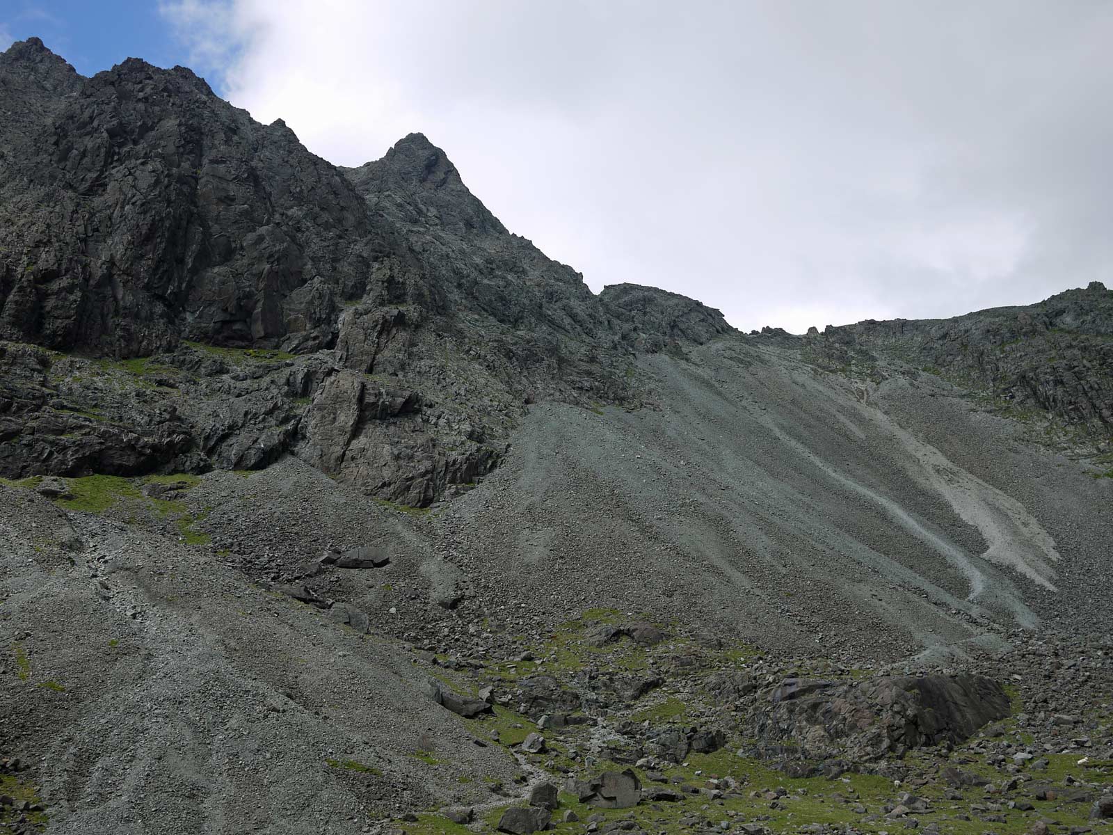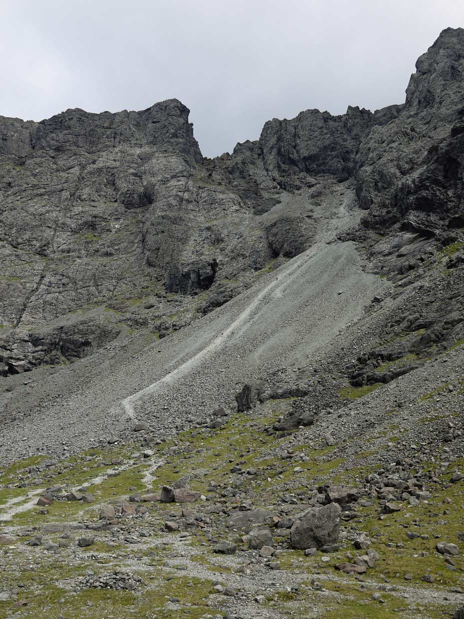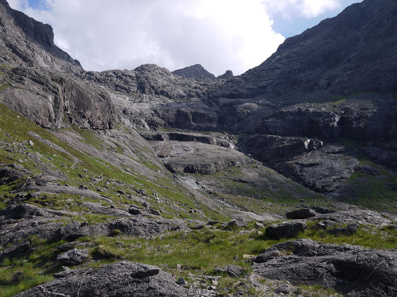The wall in the foreground is the east face of Caisteal à Garbh-choire, with Sgùrr Dubh an Da Bheinn behind and Sgùrr Dubh Mòr to the right