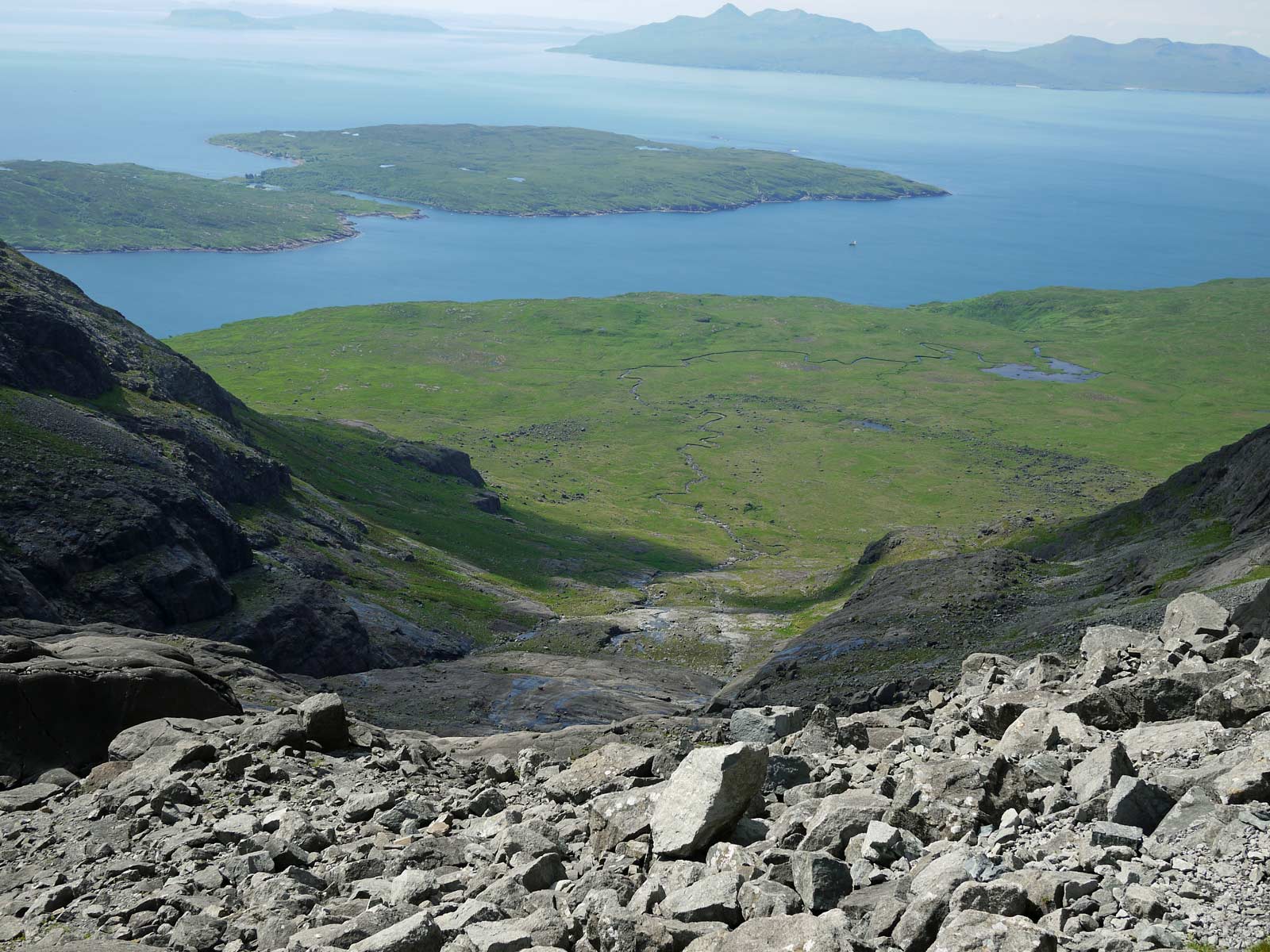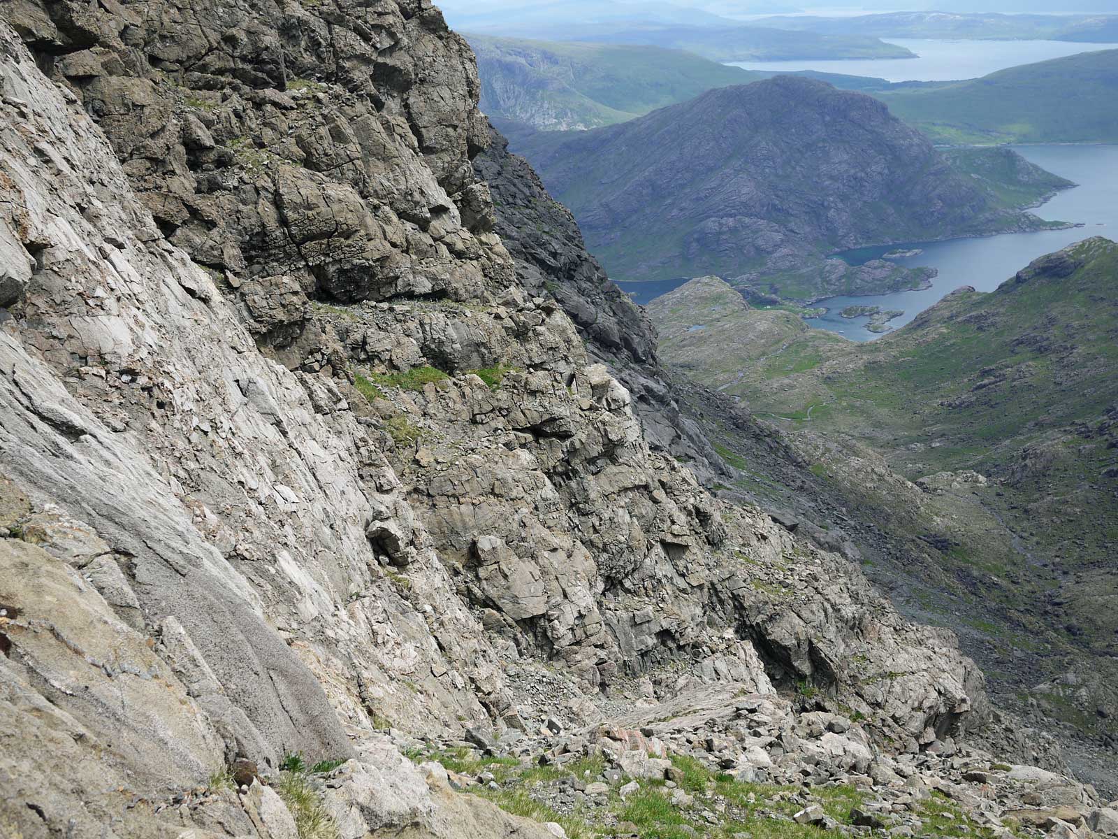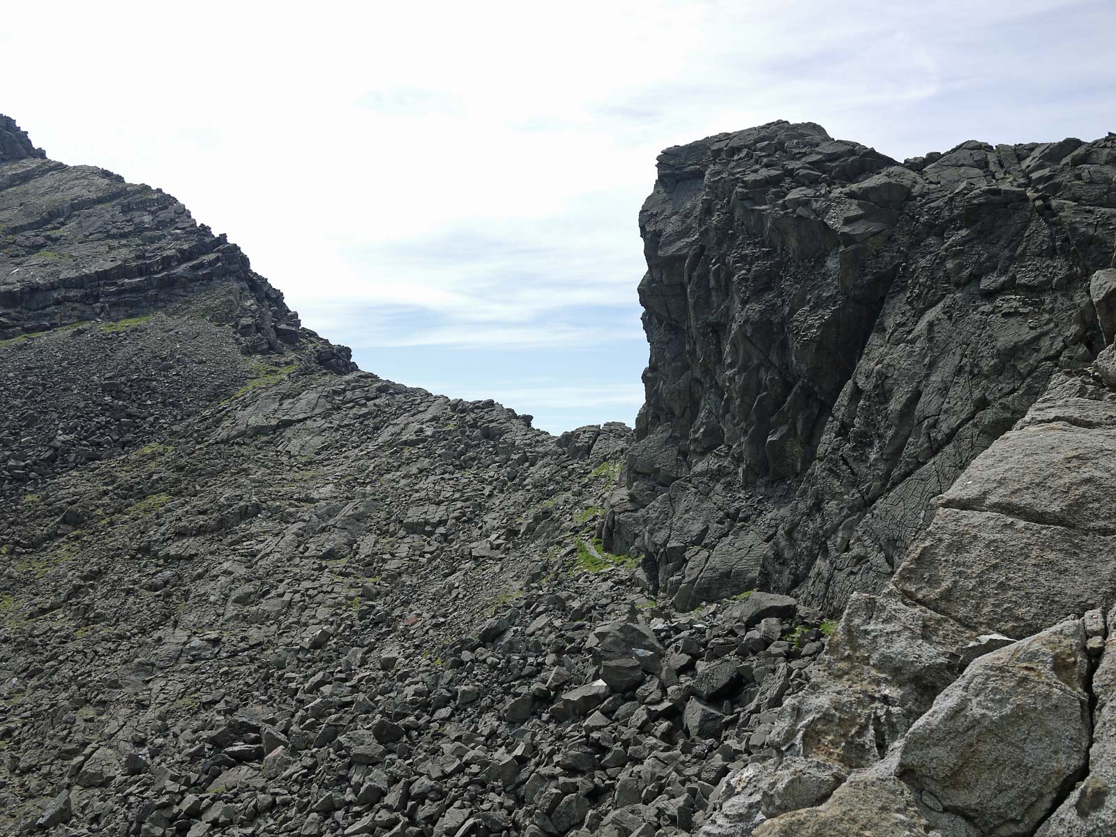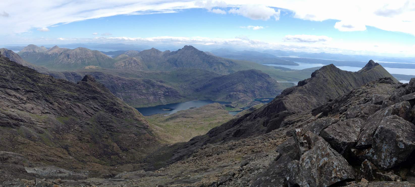 The wall in the foreground is the east face of Caisteal à Garbh-choire, with Sgùrr Dubh an Da Bheinn behind and Sgùrr Dubh Mòr to the right